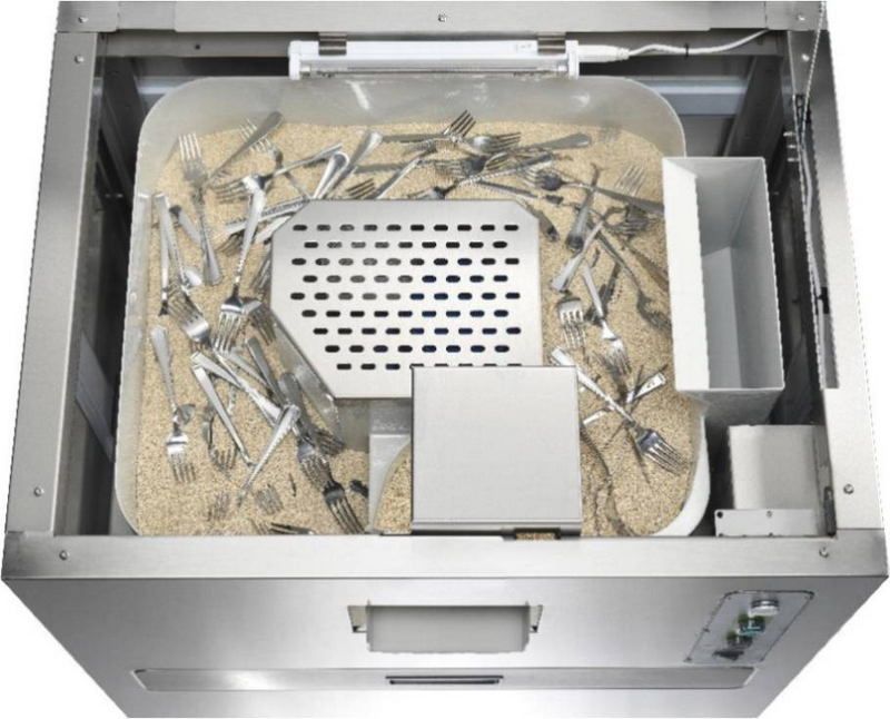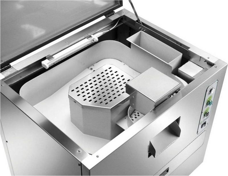 FIMAR ALP/3000представляет собой машину для сушки, полировки, стерилизации и дезинфекции столовых приборов и бокалов. В конструкции предусмотрена ультрафиолетовая лампа, уничтожающая бактерии, оставшиеся на поверхности изделий после мойки. Аппарат предназначен для быстрого высушивания, а также полировки приборов и питьевой посуды после обработки посудомоечной машиной. Это позволяет получить в короткие сроки абсолютно сухие изделия без разводов и подтеков воды. Эффект достигается за счет вибрации и трения об кукурузный порошок.