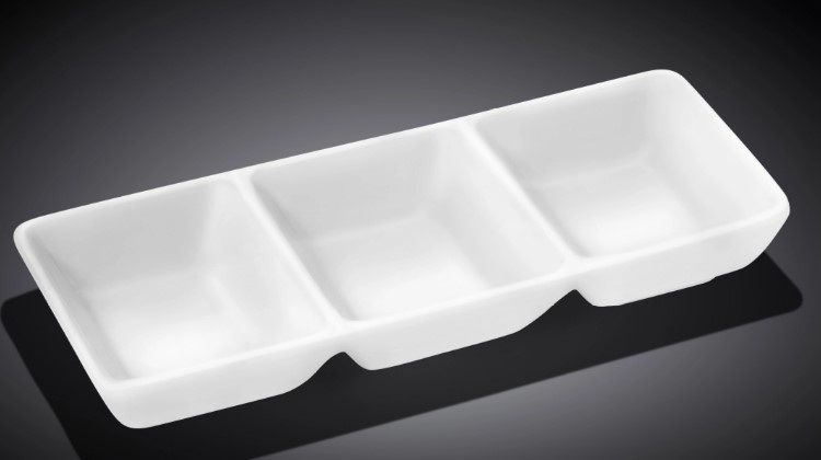 Менажница Wilmax L 150 мм, B 60 мм— трехсекционное блюдо прямоугольной формы, выполнено из высококачественного фарфора. Благодаря уникальной рецептуре материала, в состав которой включены соединения магния и алюминия, изделия обладают исключительной белизной (как на поверхности, так и на изломе), прочностью, устойчивостью к сколам. Особый состав глазури обеспечивает гладкость и блеск поверхности изделий.