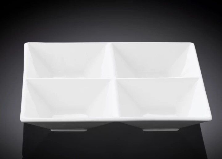 Менажница Wilmax L 150 мм, B 150 мм— блюдо из 4-х секций квадратной формы, выполнено из высококачественного фарфора. Благодаря уникальной рецептуре материала, в состав которой включены соединения магния и алюминия, изделия обладают исключительной белизной (как на поверхности, так и на изломе), прочностью, устойчивостью к сколам. Особый состав глазури обеспечивает гладкость и блеск поверхности изделий.