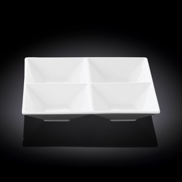 Менажница Wilmax L 200 мм, B 200 мм— блюдо из 4-х секций квадратной формы, выполнено из высококачественного фарфора. Благодаря уникальной рецептуре материала, в состав которой включены соединения магния и алюминия, изделия обладают исключительной белизной (как на поверхности, так и на изломе), прочностью, устойчивостью к сколам. Особый состав глазури обеспечивает гладкость и блеск поверхности изделий.