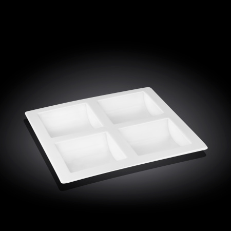 Менажница Wilmax L 260 мм, B 260 мм— блюдо из 4-х секций квадратной формы, выполнено из высококачественного фарфора. Благодаря уникальной рецептуре материала, в состав которой включены соединения магния и алюминия, изделия обладают исключительной белизной (как на поверхности, так и на изломе), прочностью, устойчивостью к сколам. Особый состав глазури обеспечивает гладкость и блеск поверхности изделий.