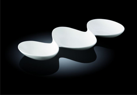 Менажница Wilmax L 370 мм, D 135/165/135 мм— трехсекционное блюдо нестандартной формы, выполнено из высококачественного фарфора. Благодаря уникальной рецептуре материала, в состав которой включены соединения магния и алюминия, изделия обладают исключительной белизной (как на поверхности, так и на изломе), прочностью, устойчивостью к сколам. Особый состав глазури обеспечивает гладкость и блеск поверхности изделий.