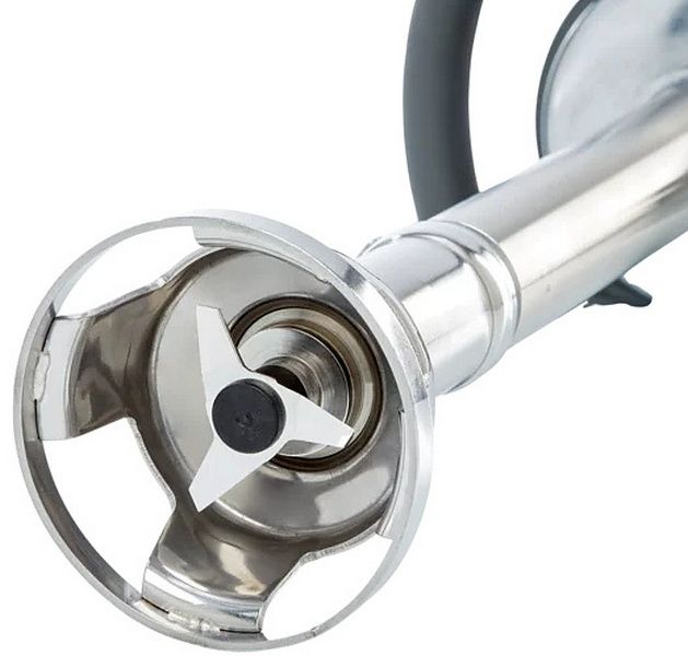 - Упрочнённая насадка с кольцом из нержавеющей стали позволяет миксеру легко скользить по дну опрокидывающейся сковороды, что делает его ещё более удобным в обращении;