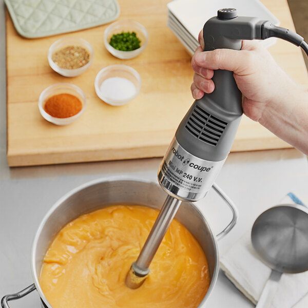 Миксер ручной Robot CoupeMini MP 240 V.V.рассчитан на приготовление небольших порций пюреобразных блюд (супов-поре, паштетов, соусов, пастообразных закусок, пюре, муссов) и взбивания жидкостей в пену. Он предназначен для профессионального применения в заведениях общепита.
