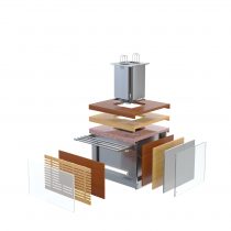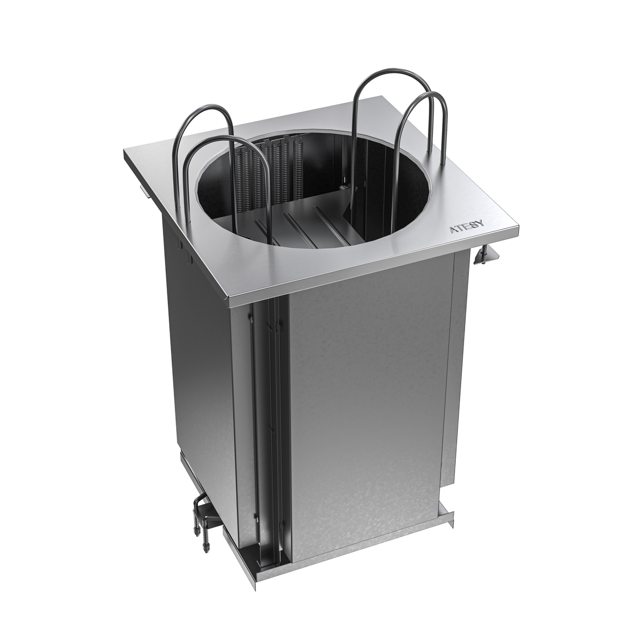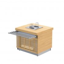 Модуль выполнен из нержавеющей стали и представляет собой прямоугольную емкость с платформой на пружинном механизме подъема. В емкость устанавливается стопка тарелок, которая зажимается проволочными ограничителями. Внутри модуля установлен ТЭН, нагревающий тарелки. По мере их доставания стопка подымается до уровня столешницы.
