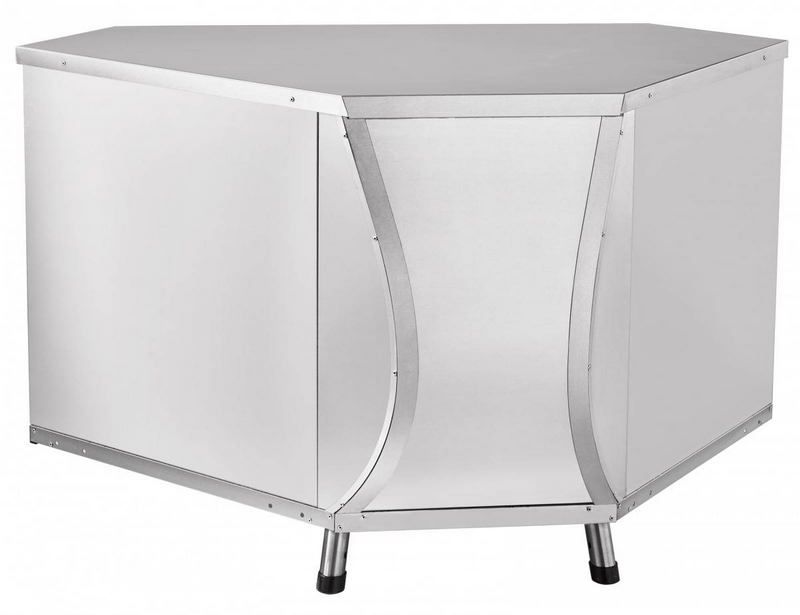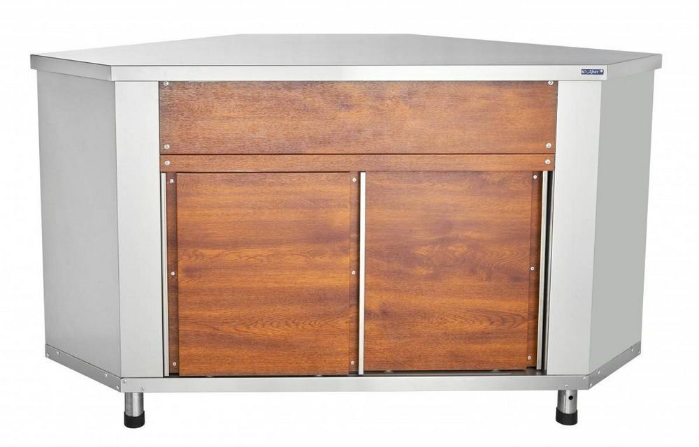 Корпус модуля имеет сложную призматическую форму и состоит из основания и обшивки из стальных листов. Передняя стенка соответствует дизайну всей линии и имеет изогнутую форму. Ее малая ширина позволяет потребителю плавно передвигать поднос по направляющим соседних элементов линии. Сверху корпус накрыт плоской столешницей. Сзади установлена распашная дверца шкафа для хранения кухонного инвентаря. Для соединения с соседним оборудованием снизу на боковых стенках предусмотрены по два отверстия. Для выравнивания высоты предназначены регулируемые ножки. Модуль полностью изготовлен из нержавеющей стали.