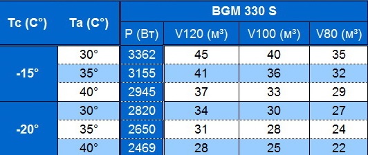 BGM 330 S — моноблок 3-го габарита, имеет по 1 вентилятору диаметром 350 мм в воздухоохладителе и компрессорно-конденсаторном блоке. Производительность вентиляторов — 3250 куб.м/час. Длина струи — 7 метров. Моноблок оснащен герметичным поршневым компрессором европейского производства («Danfoss», «L’unite Hermetique»), программируемым контроллером Eliwell EW974 для управления температурой охлаждаемого объема, вентиляторами, циклами оттайки. Для того, чтобы эксплуатировать моноблок при температуре окружающей среды ниже +12°C, вы можете дополнительно заказать и установить «зимний комплект». Дополнительные опции: концевой выключатель вентилятора испарителя, терморегулирующий вентиль (ТРВ), контроллер управления с сетевой картой (Carel или Danfoss).