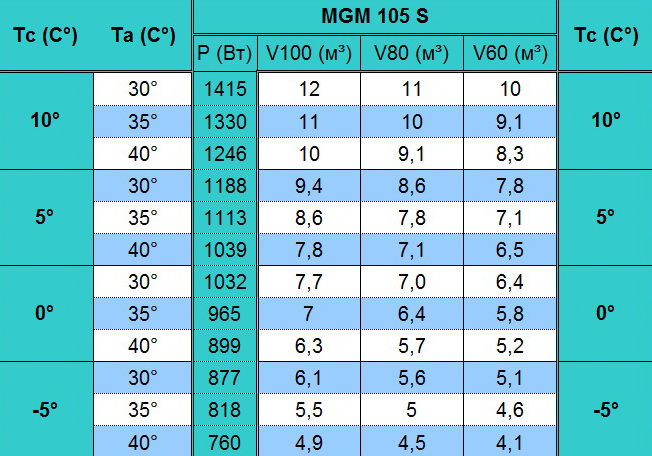 Среднетемпературный моноблок MGM 105 S с установкой настенного типа предназначен для поддержания заданной температуры в теплоизолированной холодильной камере объемом от 4,1 до 12 куб.м. Подходящий для этой модели объем определяется в зависимости от толщины панелей камеры (80 или 100 мм), температуры окружающей среды (от +30 до +40°C) и необходимой температуры в холодильной камере в диапазоне от -5 до +10°C. Корпус изделия изготовлен из оцинкованной стали толщиной 0,9 мм с полимерным покрытием (цвет белый, RAL9016). Агрегат поставляется заправленным нетоксичным озоносберегающим хладагентом R404A (доза заправки 1,1 л). В комплект входят ванна выпаривания с ТЭНом, контакторы, трубка с ПЭНом подогрева для слива конденсата.