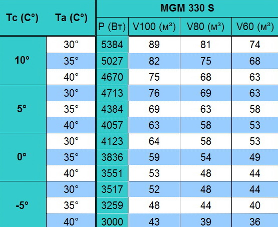 Среднетемпературный моноблок MGM 330 S с установкой настенного типа предназначен для поддержания заданной температуры в теплоизолированной холодильной камере объемом от 36 до 89 куб.м. Подходящий для этой модели объем рассчитывается в зависимости от толщины панелей камеры (80 или 100 мм), температуры окружающей среды (от +30 до +40°C) и необходимой температуры в камере (от -5 до +10°C). Корпус моноблока изготовлен из оцинкованной стали толщиной 0,9 мм с полимерным покрытием (цвет белый, RAL9016). Агрегат заправлен нетоксичным озоносберегающим хладагентом R404A (доза заправки 1,8 л). В комплект входят автоматические выключатели, ванна выпаривания с ТЭНом, контакторы, трубка с ПЭНом подогрева для слива конденсата.