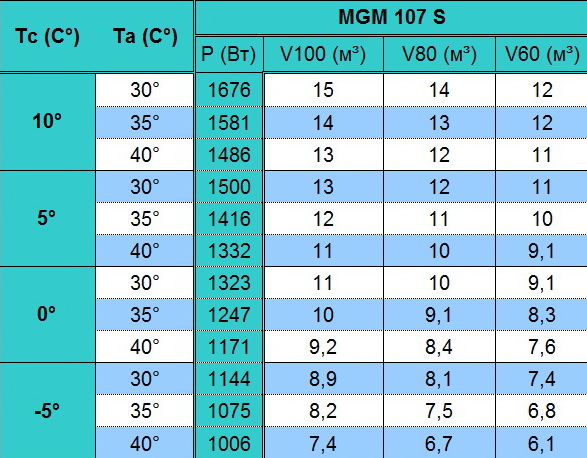 Среднетемпературный моноблок MGM 107 S с установкой настенного типа предназначен для поддержания заданной температуры в теплоизолированной холодильной камере объемом от 6,1 до 15 куб.м. Подходящий для этой модели объем рассчитывается в зависимости от толщины панелей камеры (80 или 100 мм), температуры окружающей среды (от +30 до +40°C) и необходимой температуры охлаждения в камере (от -5 до +10°C). Корпус моноблока изготовлен из оцинкованной стали толщиной 0,9 мм с полимерным покрытием (цвет белый, RAL9016). Агрегат заправлен безопасным, озоносберегающим хладагентом R404A (доза заправки 0,8 л). В комплект входят ванна выпаривания с ТЭНом, контакторы, трубка с ПЭНом подогрева для слива конденсата.