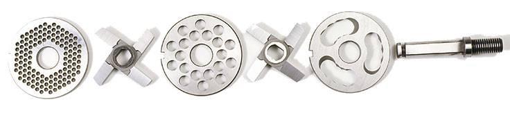 | Комплект поставки | Система ножей и решеток — полный унгер: подрезная решетка, 2 двусторонних ножа, крупная решетка, мелкая решетка, подставка на колесах |