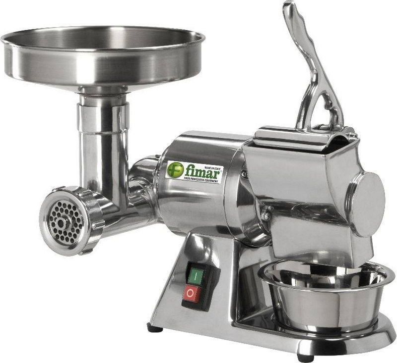 Мясорубка-теркаFIMAR 8/Dпредназначен для измельчения мяса, рыбы и других продуктов на предприятиях общественного питания и торговли. Состоит из двух блоков: мясорубки для получения фарша и тёрки для измельчения твёрдых продуктов. Оснащён микровыключателем, расположенным на прижимном рычаге тёрки. Каркас и входное отверстие тёрки изготовлены из полированного алюминия, бункер, режущий узел, ролик тёрки, решётка и нож – из нержавеющей стали.