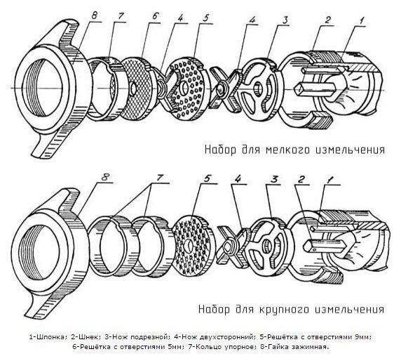 - мясорубка комплектуется системой ножей полный Unger с двумя решетками наружным диаметром 82 мм с отверстиями в них 5 и 9 мм, что позволяет измельчать фарш в оптимальной консистенции;