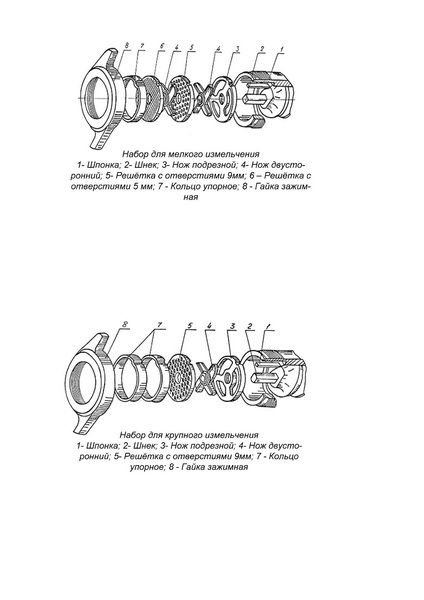 | Комплект поставки | система ножей и решеток — полный унгер: подрезная решетка, 2 двусторонних ножа, крупная решетка, мелкая решетка, купатница, толкатель |