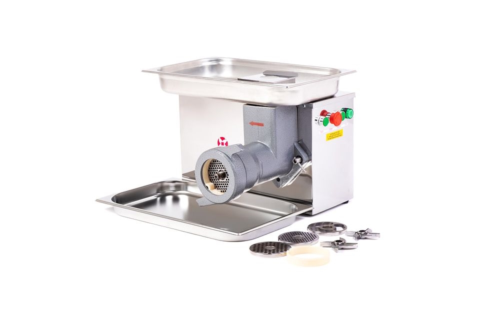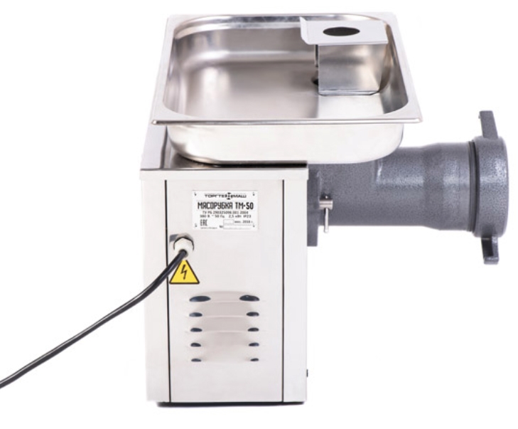 ТоргТехМаш, Барановичи ТМ-50 представляет собой электрическую мясорубку профессионального класса. Модель отлично подходит для оснащения пунктов общественного питания, торговых точек. Производительность аппарата составляет 500 кг в час. Мясорубка предназначена для измельчения мяса, рыбы, приготовления котлетной массы и фарша. Для измельчения используется система полный унгер, которая предполагает наличие подрезного, двустороннего ножа, крупной и мелкой решетки. Применение червячного редуктора позволяет существенно снизить уровень шума.