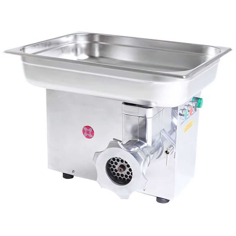 Мясорубка ТоргТехМаш, Барановичи ТМ-32Упредставляет собой электрическую мясорубку профессионального класса. Устройство рассчитано на применение в сфере общественного питания, торговли, оно предназначено для измельчения в фарш рыбы, мяса, повторного измельчения котлетной массы, набивки колбасных изделий. Устройство работает по принципу «полный унгер», которая предполагает наличие подрезной решетки, двух двусторонних ножей, промежуточной решетки, расположенной между ножами, конечной решетки с мелкими ячейками. Такая система обеспечивает однородное измельчение. В устройстве применяется бесшумный червячный редуктор. Система реверс позволяет освободить шнек от намотанных на него жил без разборки оборудования. Все компоненты конструкции, контактирующие с продуктами, изготовлены из нержавеющей стали.