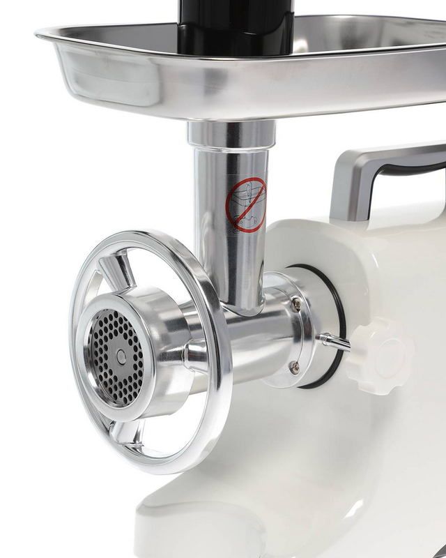 В комплекте присутствуют 2 насадки для приготовления колбасок и 3 решетки для измельчения мяса. Управление мясорубкой осуществляется с помощью ручки, расположенной на корпусе.