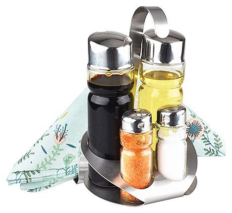 Солонка, перечница, бутылочка для масла, бутылочка для уксуса, подставка с салфетницей