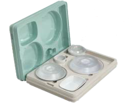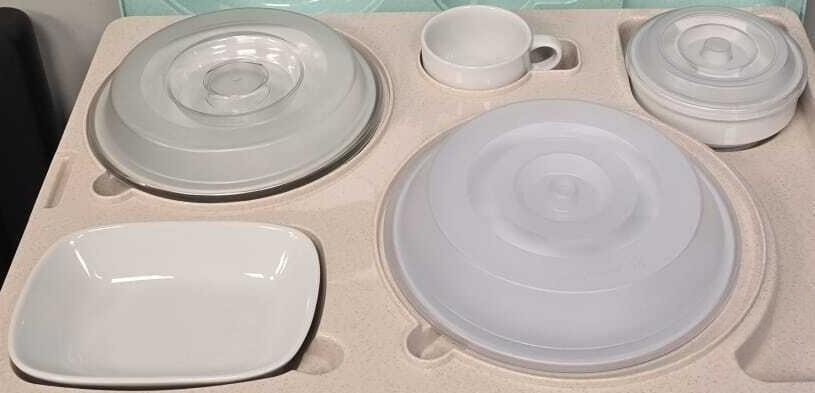 Набор посуды для термоподноса Tribeca TT-5N фарфор— состав набора: тарелка круглая 23 см с крышкой, тарелка 20 см с крышкой, тарелка прямоугольная 17 см, миска 12 см с крышкой, чашка 250 мл. Материал — фарфор, материал крышек — пластик.