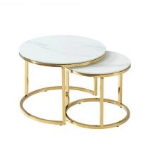 Два журнальных столика с белой круглой столешницей под мрамор разного размера в наборе. Столешница выполнена из закаленного стекла. Каркас изготовлен из нержавеющей стали с гальваническим покрытием с применением нитрида титана. Такое покрытие обладает рядом преимуществ: