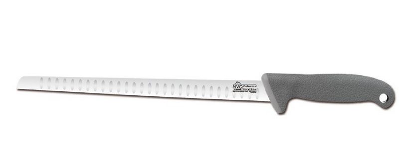 Нож для нарезки рыбы MVQ PROFI COLOR L 450 мм (длина лезвия 300 мм)предназначен для работы с рыбным филе. Длинное гибкое лезвие ножа позволяет легко отделить филе тунца, лосося и других видов рыб от костей. Специальные насечки-выемки на лезвии ножа для нарезки рыбы помогают избежать прилипания филе к поверхности ножа.