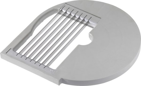 Диск имеет сложную форму в виде круга с угловым элементом, в котором установлен блок длинных лезвий для нарезки соломки. Основание диска и лезвия изготовлены из нержавеющей стали.