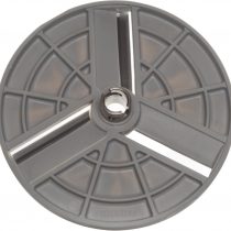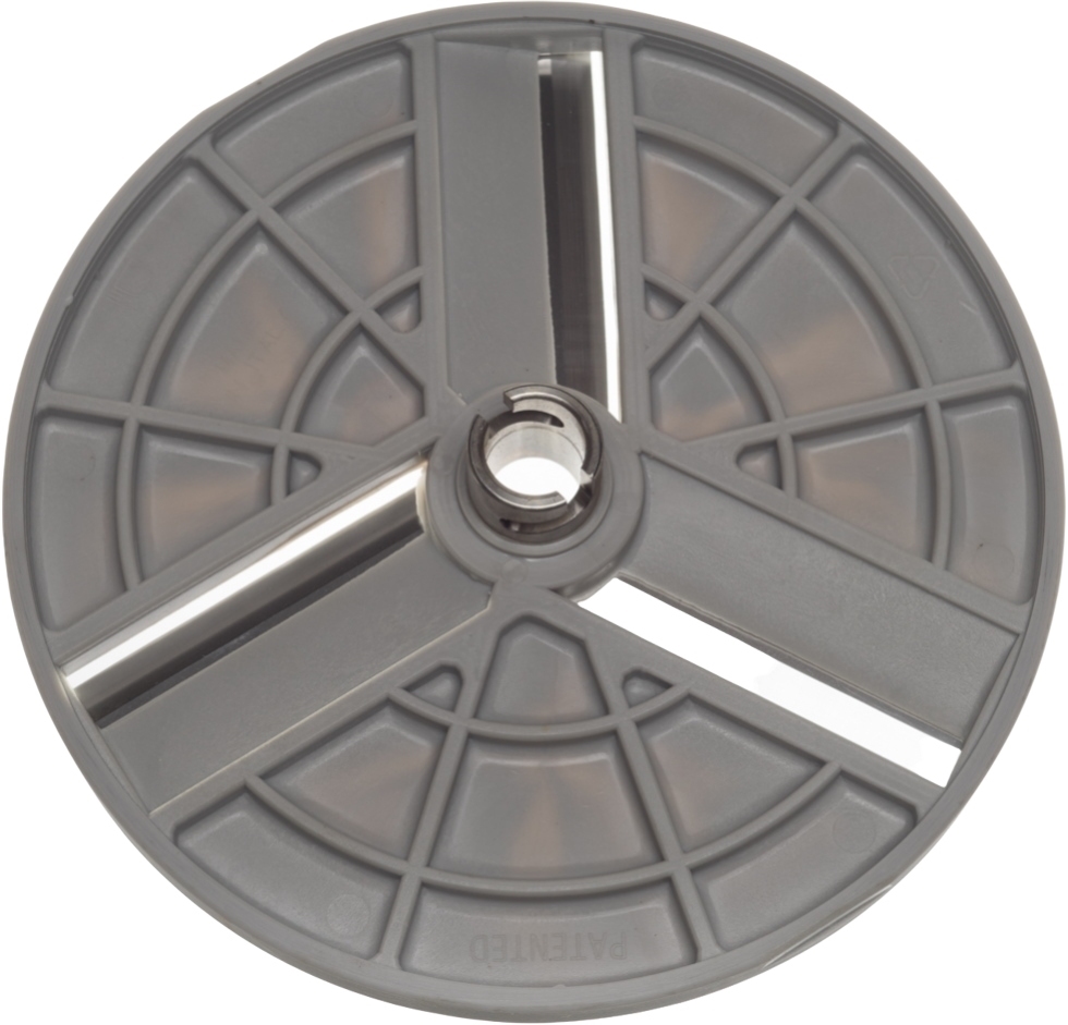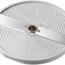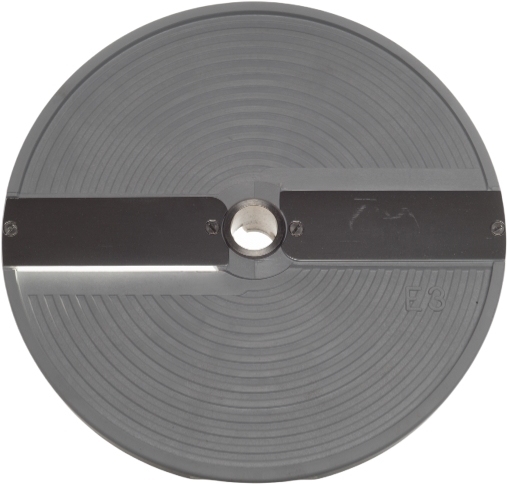 Диск изготовлен из пищевой нержавеющей стали. На его поверхности предусмотрены концентрические углубления, исключающие прилипание слайсов. На поверхности в диаметральном направлении установлены два стальных ножа с прямыми режущими кромками.