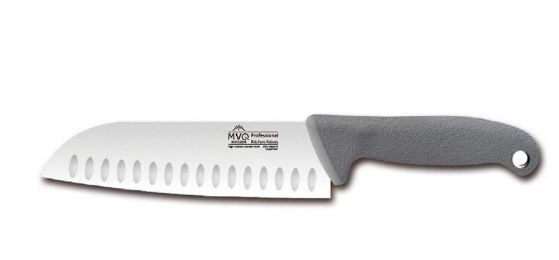 Нож-сантоку MVQ PROFI COLOR L 305 мм (длина лезвия 180 мм)предназначен для измельчения большого количества филе или зелени одновременно. В нарезке ингредиентов используется вся поверхность клинка, продукты измельчаются без применения силы движениями вверх-вниз. «Сантоку» буквально переводится как «три хороших вещи» или «три вида использования», что говорит о пригодности ножа хорошо резать, рубить и крошить. Размер сантоку удобен для резки мелкими ломтиками или кубиками как мяса, так и овощей. Клинок сантоку имеет остриё в виде «овечьей ноги». В отличие от ножа-шефа лезвие сантоку почти параллельно рукоятке. Лезвие широкое, тяжелое, сведено книзу, как правило, короче, чем у ножа-шефа. На лезвии ножа сантоку PROFI COLOR есть специальные насечки-выемки, чтобы продукты не прилипали в процессе нарезки.