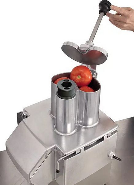 Подача продуктов для нарезки производится через две воронки на крышке. Большая воронка оснащена рычажным толкателем, она используется для загрузки крупных кусков или целых овощей и фруктов. Узкая воронка имеет цилиндрическую форму и рассчитана на тонкие продукты удлиненной формы. Она снабжена ручным толкателем из пластика. Нарезка продуктов осуществляется непосредственно в бункере при помощи режущего диска. Бункер имеет боковой отвод для выхода готовых нарезанных кусочков. Овощерезательная машина включается с помощью кнопки пуска на фронтальной панели корпуса.