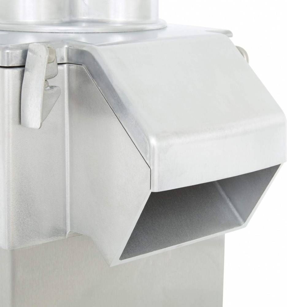 Овощерезка представляет собой блок двигателя в корпусе прямоугольной формы, на который крепится рабочая емкость с крышкой. Емкость, крышка и ее элементы изготовлены из металла, корпус и вал двигателя — из нержавеющей стали. Прибор может поставляться с одно- или трехфазным асинхронным двигателем, имеющим постоянную скорость вращения, данная модель однофазная 220В. Управление его работой производится кнопками Пуск и Стоп на лицевой панели корпуса. На моторном блоке установлена емкость для нарезки продуктов с боковым рукавом для готовых кусочков. Режущий диск располагается внутри емкости на валу мотора. Емкость закрывается крышкой с двумя загрузочными отверстиями. Большое D-образное рассчитано на целые овощи или крупные их куски и имеет толкатель рычажного типа. Малое цилиндрическое отверстие предназначено для длинных или нежных продуктов, снабжено пластиковой вставкой меньшего диаметра и ручным толкателем. При открытии крышки или откидывании рычажного толкателя двигатель автоматически останавливается.