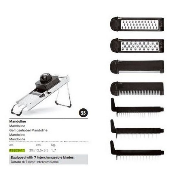 Овощерезка-мандолина Paderno H125 мм, L400 мм, B45 мм 7 насадок,металл,пластик; металлич.,черныйпредназначена для использования в сфере общественного питания, торговли, а также применения в домашних условиях. Модель итальянского производства выполнена из пластика и металла. Применение качественных материалов гарантирует прочность изделия. В комплект поставки входит 7 насадок для нарезки разной толщины.