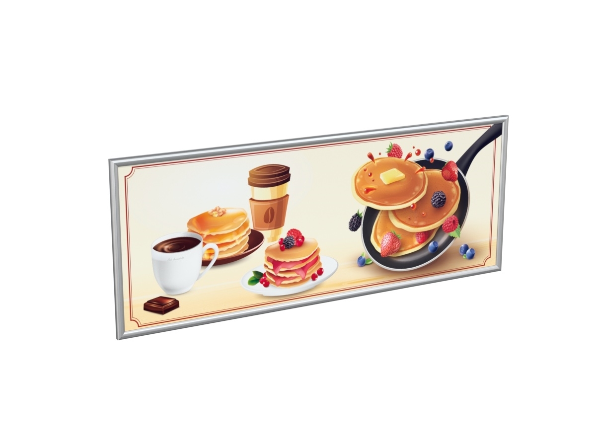Панель световая для блинной станции Лакомка БС-2.400-1350.750-02 Атеси предназначена для установки на фасадную часть оборудования. Она рассчитана на установку рекламного постера, позволяет сделать блинную станцию заметнее, привлекательнее для потенциальных клиентов. Конструкция состоит из светорассеивающей матрицы, на которой размещается цветной постер. Дополнительно предусмотрен пластиковый экран для защиты изображения. Крепления постера и экрана производится по клик-системе. Светодиодная подсветка встроена в рамку.