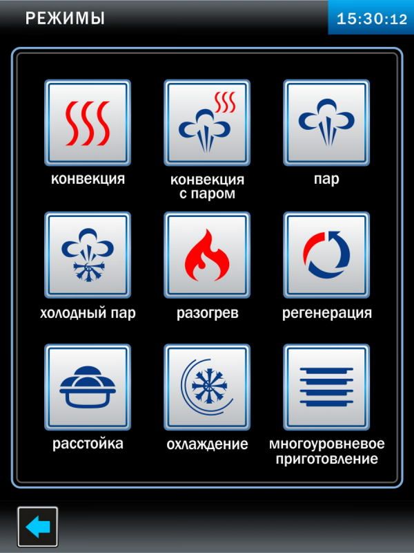 - 9 режимов работы: конвекция, конвекция с паром, пар, холодный пар, разогрев, расстойка, регенерация, охлаждение, многоуровневое приготовление.