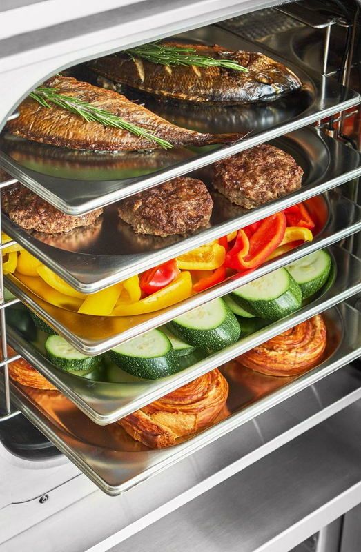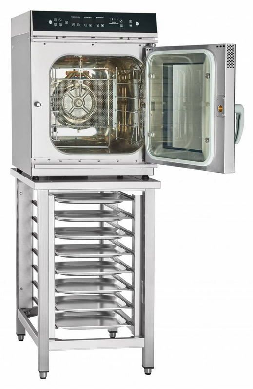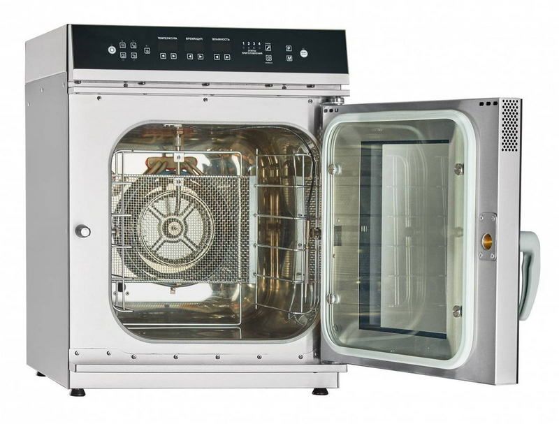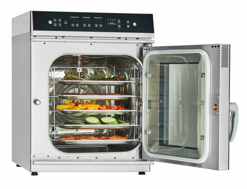 В пароконвектомате предусмотрено 5 режимов работы, в частности конвекция, конвекция + пар, пар, холодный пар, разогрев. Также предусмотрена память на 110 пользовательских программ, каждая из которых может состоять из 4 этапов. Камера вмещает в себя 6 гастроемкостей типоразмера GN1/2. Такая конструкция позволяет готовить сразу несколько блюд, при этом ароматы и вкусы не смешиваются.