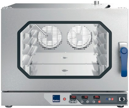Оборудование имеет 4 уровня расположения противней размером GN 1/1, 600х400 мм. Специальная программа помогает выполнять чистку рабочей камеры в ночное время. Освещение позволяет видеть процесс приготовления пищи без необходимости открывания дверцы. Присутствует наружный разъем для второго термощупа.