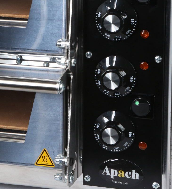 Печь для пиццы ApachAMS1– многофункциональное тепловое оборудование, которое используют для выпечки пиццы и других хлебных изделий, а также для подогрева готовых блюд. Корпус изготовлен из антикоррозийного металла, в боковых панелях есть вентиляционные отверстия. При выходе в рабочий режим на панели загораются индикаторы, с помощью регуляторов можно вариативно выбирать мощность для отдельной зоны нагрева. Электропечь предназначена для настольного размещения, подключается к сети 220 В.