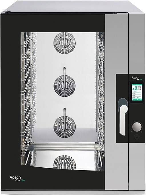 Apach AB10QTпредставляет собой современную многофункциональную конвекционную печь. Она позволяет выпекать различные кондитерские и хлебобулочные изделия, запекать блюда, а также разогревать полуфабрикаты. В модели присутствует система инжекторной парогенерации, она позволяет обеспечить заданный уровень влажности сразу после включение печи. Аппарат может работать в режиме конвекции (от 30 до 260 град), конвекция +пар, приготовления на пару. Память печи рассчитана на 120 программ (40 предустановленных производителем и 80 пользовательских), каждая из них включает до 6 этапов.