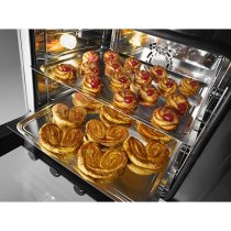 Прямоугольный компактный корпус печи выполнен из нержавеющей стали. Рабочая камера с закругленными углами изготовлена из пищевой стали. В ней установлены вентилятор для конвекции, нагревательные элементы с пониженным энергопотреблением, система непрямого пароувлажнения. Для размещения противней размером 429х345 мм или гастроемкостей GN 2/3 предусмотрены 4 пары направляющих.
