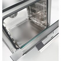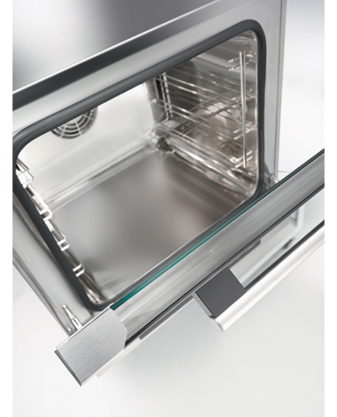 Компактный корпус печи обладает прямоугольной формой и изготовлен из нержавеющей стали. Из пищевой стали выполнена рабочая камера со скругленными углами. В камере установлен вентилятор для конвекции, нагревательные элементы с пониженным энергопотреблением, инжектор для парообразования. Для размещения гастроемкостей GN 2/3 или противней размером 429х345 мм предусмотрены 4 пары стальных направляющих.