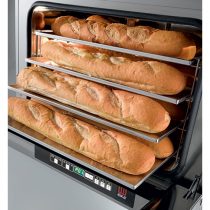 Корпус печи имеет прямоугольную форму, компактные габариты и выполнен из нержавеющей стали. Рабочая камера с закругленными углами изготовлена из пищевой стали. Камера оборудована нагревательными элементами, вентилятором для конвекции, инжектором для парообразования. Также в ней установлены 4 пары направляющих для противней размером 480х340, подходящих для выпечки полубагетов.