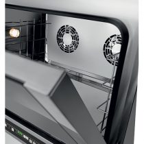 Печь имеет прямоугольный нержавеющий корпус, встроенную рабочую камеру с закругленными углами из пищевой стали. Камера оборудована нагревательными элементами, системой парогенерации, двумя реверсивными вентиляторами для конвекции. Для размещения 4-х противней размером 600*400 мм предусмотрены направляющие.
