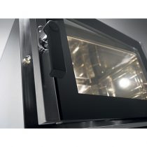 Печь имеет прямоугольный нержавеющий корпус компактных габаритов и встроенную рабочую камеру из пищевой стали с закругленными углами. Камера оснащена нагревательными элементами, инжектором для парообразования, двумя реверсивными вентиляторами для конвекции, 4-мя парами направляющих для противней размером 600*400 мм.