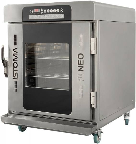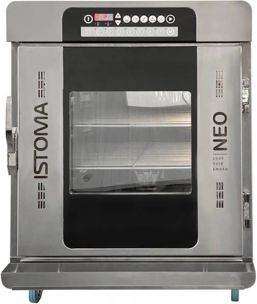 Istoma NEOпредставляет собой низкотемпературную печь с возможностью копчения. Она обеспечивает деликатное приготовление продуктов, отлично подходит для профессионального применения. Печь позволяет проводить ароматизации продукта и при горячем, и при холодном копчении натуральной щепой. На корпусе установлена электронная панель управления с ЖК-дисплеем. Дополнительно предусмотрен термощуп.