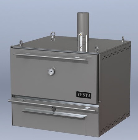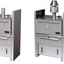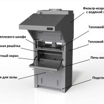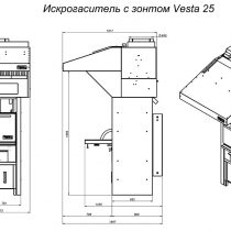 Требования к установке: подставка Vesta, на нее устанавливается печь-мангал, затем тепловой шкаф, сверху водяной искрогаситель (смотрите рисунки ниже главной картинки). Расстояние до другого оборудования должно быть не менее 10 см. Может подключаться к системе общей вентиляции.