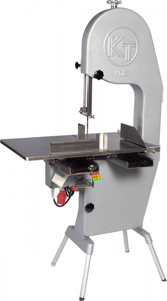 Пила для резки мяса Koneteollisuus (KT)KT-400– профессиональное электрооборудование в напольном исполнении для распила на порционные куски (без дробления кости) мяса, птицы, рыбы прессованной в бруски. Пила устанавливается в пищевых цехах для фасовки продукции в вакуумную упаковку, для подготовки порционных кусков перед выкладкой в охлаждаемой витрине. Производитель также предлагает аналогичную модель с меньшим полотном и скоростью движения ленты KT-325.