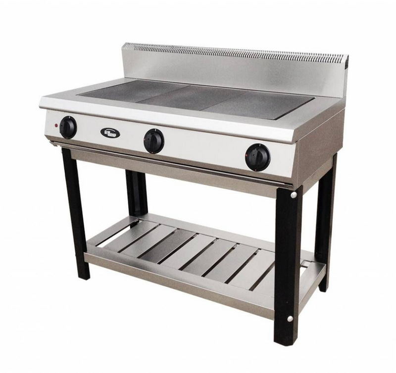 Плоская рабочая поверхность позволяет легко перемещать посуду. Плита установлена на открытом стенде с полкой для инвентаря. Имеет разборную конструкцию, что исключает сложности при её установке. Электроплита полностью изготовлена из нержавеющей стали, оснащена воздуховодом, тремя пакетными переключателями, индикатором работы и защитным бортом.
