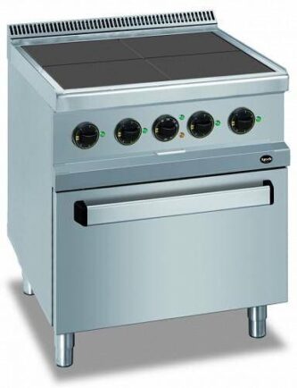 Напольная электрическая плита от фирмы Гриль Мастер модель Ф4ЖТЛПДЭ используется на профессиональных кухнях для приготовления горячих блюд. Модель оснащена духовым шкафом с подсветкой на 8-мь загрузочных уровней и 4-мя плоскими, прямоугольными гладкими конфорками (295х415). Слева от духового шкафа расположена открытая нейтральная полка для хранения кухонной утвари. Панель управления – электромеханическая, расположена под рабочей поверхностью. Время разогрева до рабочей температуры от 20 до 30 минут. Корпус – нержавеющая сталь. Мощность 16,5 кВт.