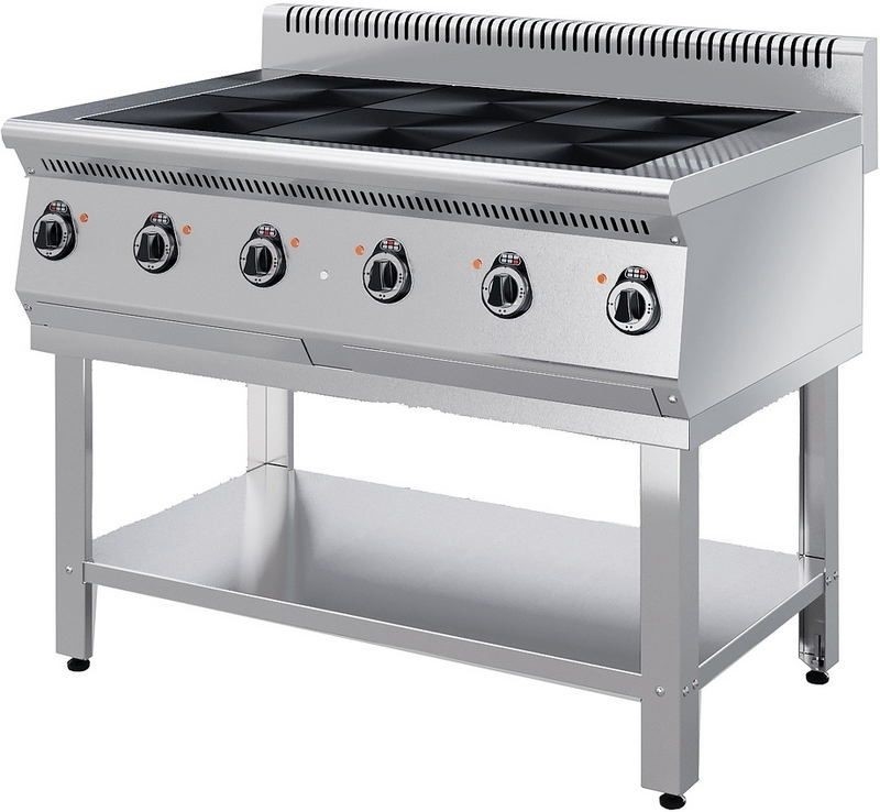 Конфорки изготовлены из чугуна, а лицевая панель и корпус – из нержавеющей стали. Предусмотрено 6 уровней мощности конфорок. Присутствует эффективная защита оборудования от перегрева.