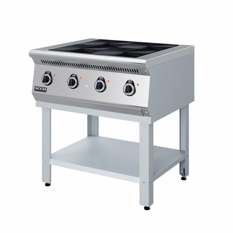 Плита электрическаяМХМ ПЭ47П— 4-комфорочная, без духового шкафа. Установлена на открытом стенде-подставке. Оптимальна для крупного формата предприятий питания. Позволяет одновременно готовить первые, вторые и третьи блюда. Модель без воздуховода. Плоские конфорки квадратной формы плотно прилегают друг к другу, что обеспечивает удобное передвижение посуды по всей рабочей поверхности. Плита оснащена мощными ТЭНами.