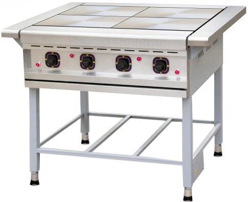 Онега ПЭ — 4 (без ж/ш)представляет собой электроплиту профессионального класса. Модель предназначена для оснащения пунктов общественного питания, торговых точек. Она рассчитана на приготовление блюд путем жарки, варки с использованием наплитной посуду. На рабочей поверхности установлено 4 конфорки из чугуна, из которых формируется единая панель. Конструкция установлена на открытую подставку, в которой предусмотрена открытая полка для хранения инвентаря и посуды.